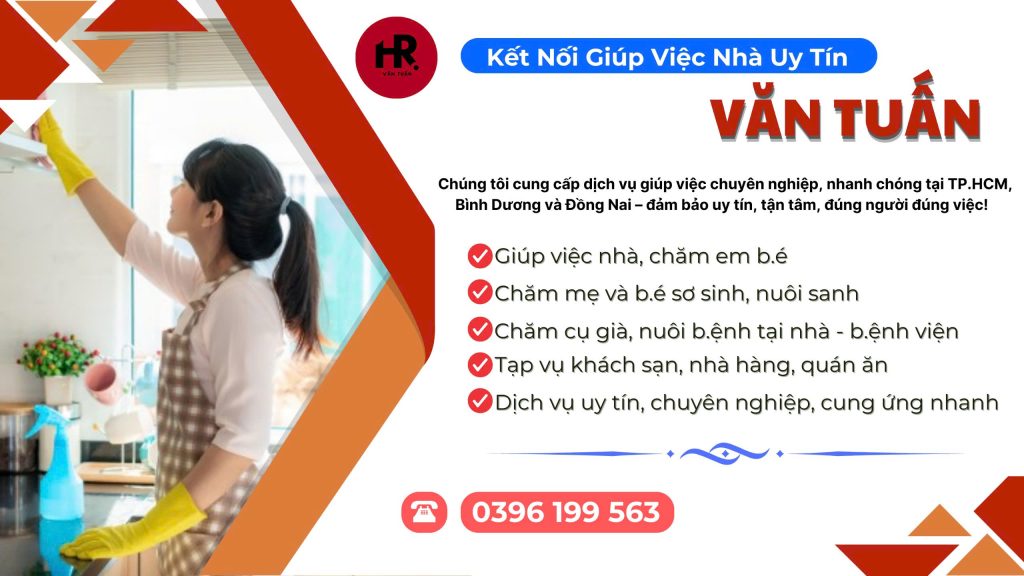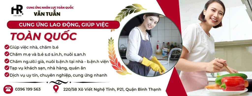 Văn Tuấn với nhiều năm trong lĩnh vực giúp việc nhà, giúp việc theo giờ, giúp việc chăm em bé, giúp việc chăm người già, người bệnh, cung ứng nguồn lao động…khắp cả nước, đặc biệt là TP.HCM và các tỉnh lân cận;